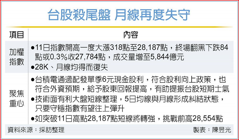 美國政府停擺跨出重要一步,激勵美股走揚,台股11日一度大漲318點,盤中站回28,000點整數大關,惟追價力道薄弱及外資賣超173.68億元,漲勢快速「消風」,電子股跌多漲少,資金轉進塑化、金融等非電族群,28,000點已失守五個交易日。