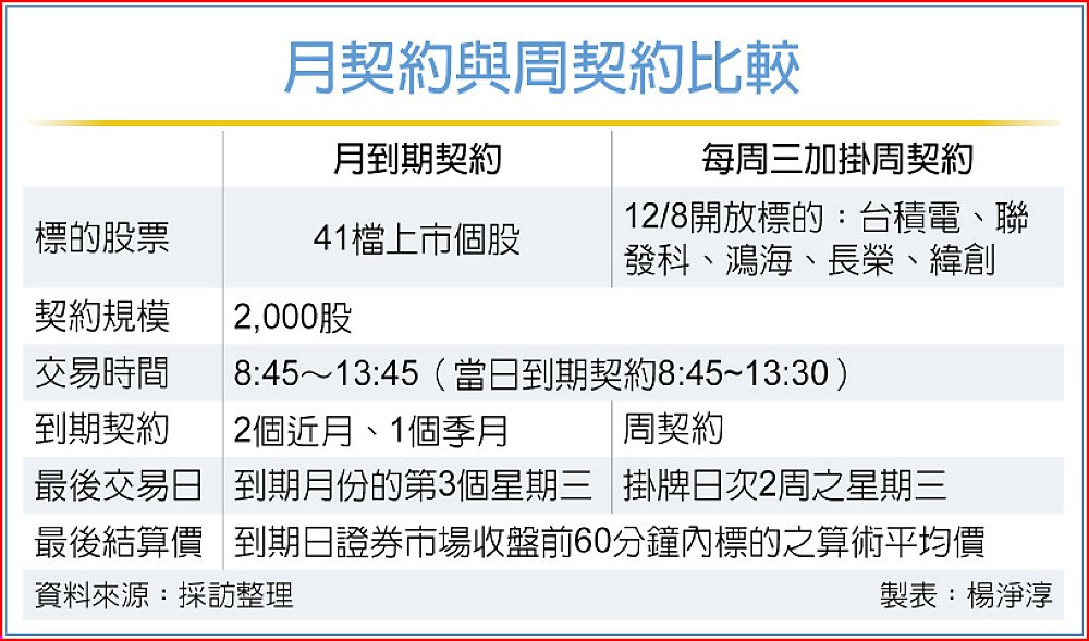 臺灣期貨交易所將於12月8日推出「個股周選擇權」,形成周周皆有契約到期的完整架構,首波掛牌五檔標的包括台積電、聯發科、鴻海、長榮及緯創,涵蓋半導體先進製程、IC設計、AI伺服器與航運等熱門題材。