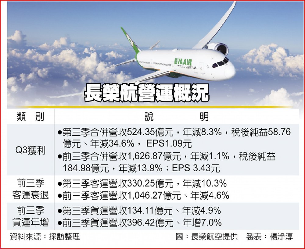 長榮航第三季合併營收524.35億元,年減8.3%,因費用增加、其他利益損失等干擾,稅後純益58.76億元,年減34.6%,EPS1.09元。