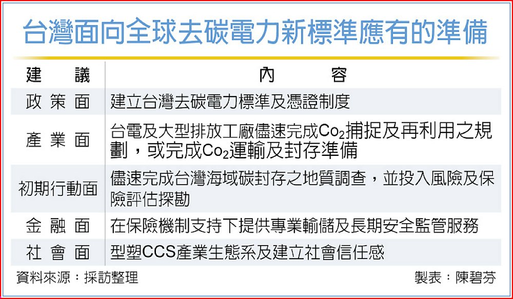 台灣會被全球夥伴認同,左峻德提醒,一則是「全球最髒500排放源」台灣有8家,市場胃納量足夠,而台灣作為全球倡議者,大型業者的台電及大型排放工廠,更應儘速完成Co2捕捉及再利用之規劃,或完成Co2運輸及封存準備,而政策面更要接棒建立台灣去碳電力標準及憑證制度,後續有許多基礎建設都需跟上。