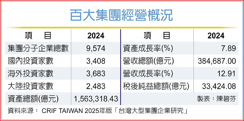 CRIF「2025年版台灣大型集團企業研究」調查結果11日公布,百大集團分子企業總數9,574家,達歷史新高點;入榜取決點則自2020年的資產總額659億元,上調至2024年的904億元,資產總額每年平均須成長49億元,一旦遭逢產業趨勢驟變,極可能跌出榜外。