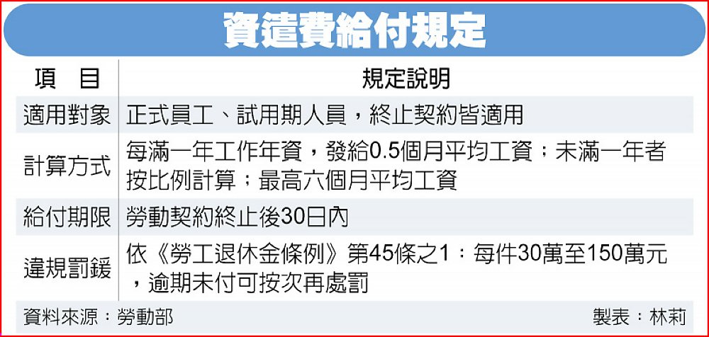 勞動福祉退休司長黃維琛指出,部分公司聘用員工,雖還在試用期、工作天數僅數日,換算下來資遣費可能僅數百元,仍須依法支付。若雇主疏忽未給付,勞動部可依規處以每件30萬元以上、150萬元以下罰鍰。