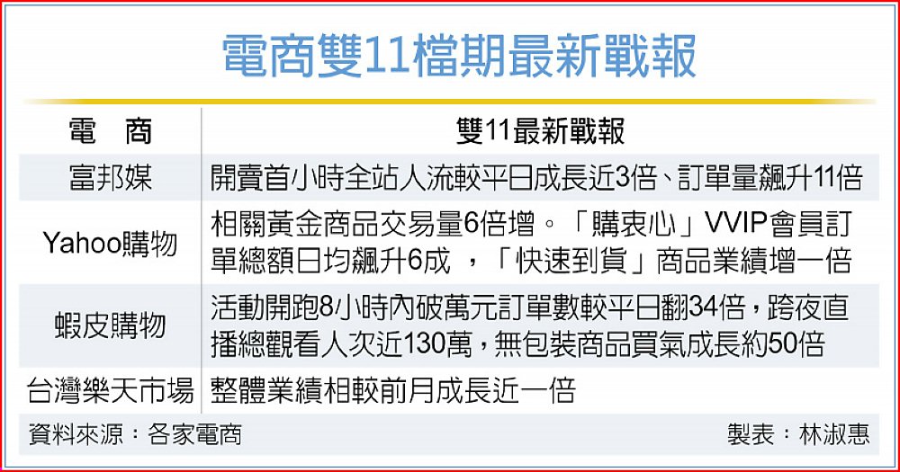 雙11大慶11日進入下單爆發潮,各大電商平台買氣激增,momo富邦媒最新統計,活動自11日凌晨零點開跑即引爆買氣,開賣首小時全站人流較平日成長近3倍、訂單量更飆升11倍,寫下亮眼開局。Yahoo購物業績翻倍漲、保值黃金飆6倍、快速到貨買氣倍增。蝦皮在活動開跑8小時內,破萬元訂單數亦較平日翻34倍。