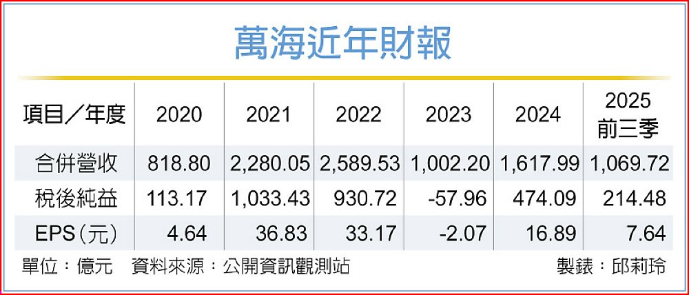 萬海累計前三季合併營收1,069.72億元、年減11.06%,營業利益268.92億元、年減28.25%,稅後純益214.48億元、年減38.05%,EPS為7.64元。