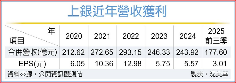 上銀11日公布第三季財報,第三季合併營收59.95億元,本業獲利4.11億元,認列匯兌收益2.18億元,推升稅後純益達4.46億元,季增230%,仍比去年同期衰退約33%,單季EPS為1.26元。累計前三季合併營收177.60億元,本業獲利13.28億元,稅後純益10.64億元,EPS為3.01元。