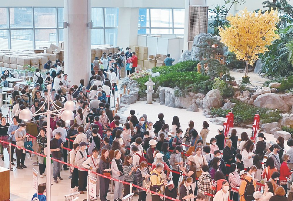 SOGO周慶第二波,台北復興店加碼回饋禮,11日就吸引逾800人無懼颱風雨勢,排隊搶換平底鍋,忠孝店也湧現兌換「小白披毯」的APP會員人潮。