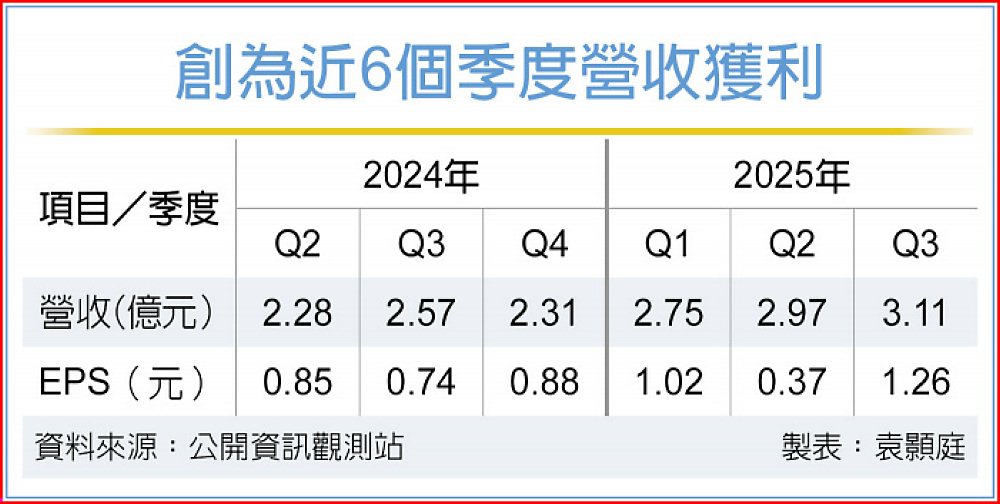 創為精密第三季合併營收3.11億元,季增5%、年增20.9%。由於北美地區客戶第二季提早拉貨,高毛利產品提早出貨,再加上匯率影響,使得毛利率略減至37.3%,營業利益5,600萬元,稅後純益5,267萬元,季增243%、年成長66.1%,單季EPS為1.26元。