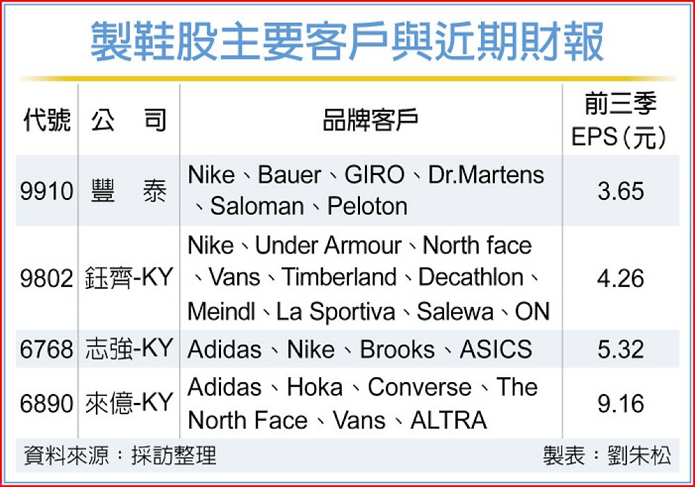 Nike業績優於預期,切入供應鏈的製鞋股,包括豐泰(9910)、鈺齊-KY(9802)、志強-KY(6768)、來億-KY(6890)等,前三季業績受惠,來億-KY前三季合併營收290.27億元,稅後純益22.84億元,EPS達9.16元,居製鞋業EPS冠軍。