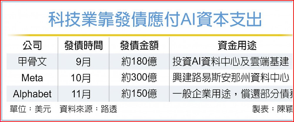 雲端服務產業包括Google、Meta、微軟與亞馬遜在內,近期在公開及私募市場發債總額高達1,400億美元,估全年發行量將達1,600億美元。AI資料中心建設成本飆升讓資金需求越滾越大。