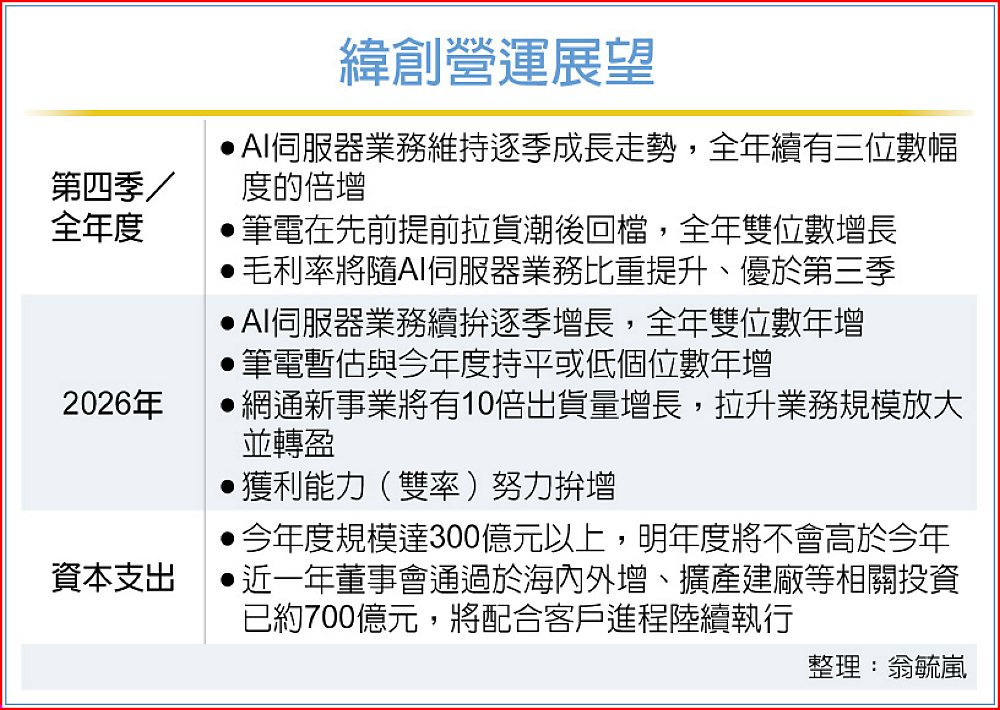 緯創今年在AI伺服器逐季走高帶動下,第三季再度交出營收獲利雙創高的成績,總經理暨執行長林建勳12日於法說會中,釋出對AI伺服器業務持續強勁增長的樂觀展望。林建勳表示,2026年在高基期下、仍可望有雙位數的增幅,同時整體獲利能力反映在雙率上的表現,緯創也期望能努力保持逐年成長走勢。
