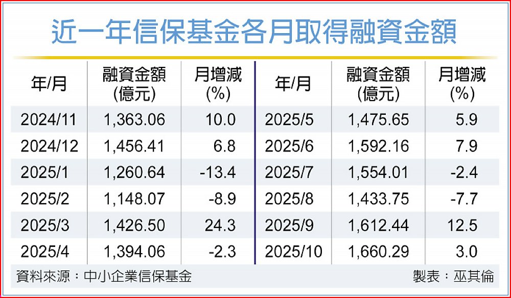 另因颱風接連來襲,信保基金啟動推出融資方案,包括中小企業修復專案貸款、企業小頭家貸款、受災旅宿業貸款及協助災區住宅修繕貸款等,推高10月融資規模,9月、10月協助取得融資金額已連二月衝上1,600億元大關。