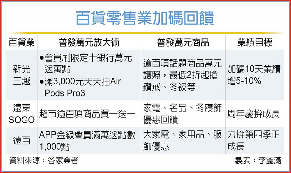 政府普發萬元現金12日起入帳,各家百貨業者爭相加碼搶數千億商機。百貨龍頭新光三越不僅推逾百款名品萬元護照,更加碼400萬會員刷10家指定銀行萬元送萬點、滿3,000可抽大獎等優惠,預估將帶動11月業績成長5%,其中加碼活動10天業績將能成長5%~10%。