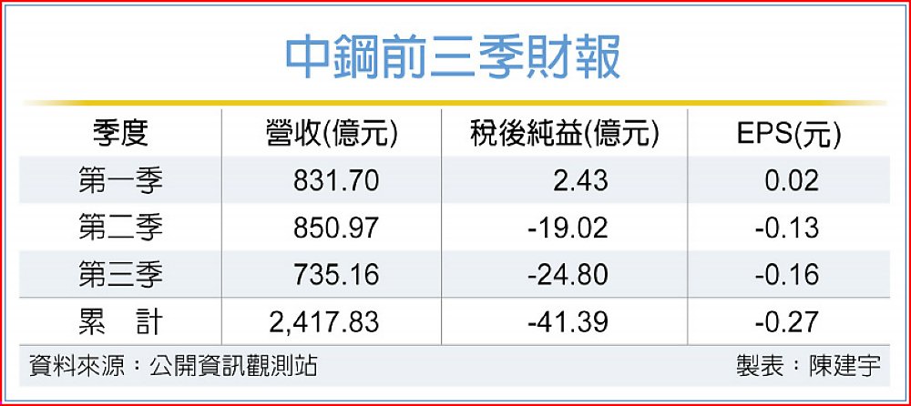 中鋼12日公布第三季財報,虧損較第二季進一步擴大,累計前三季稅後純損41.39億元,每股純損0.27元。中鋼高層表示,第三季不僅是景氣低谷,同時氣候、關稅、大陸低價出口等問題也衝擊中鋼獲利,但中鋼還是會繼續強化自身體質,提升產品價值並加快外銷輪動的速度。