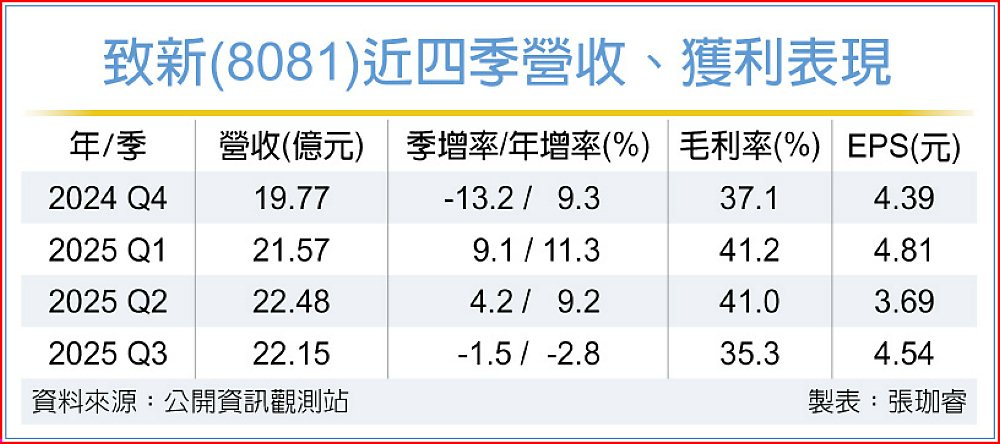 致新10月合併營收6.93億元,月減4.42%、年增1.61%,傳統淡季到來,加上半年客戶提前拉貨,第四季估呈季減,合併營收介於20~21.5億元,平均匯率轉佳下,毛利率將好轉。
