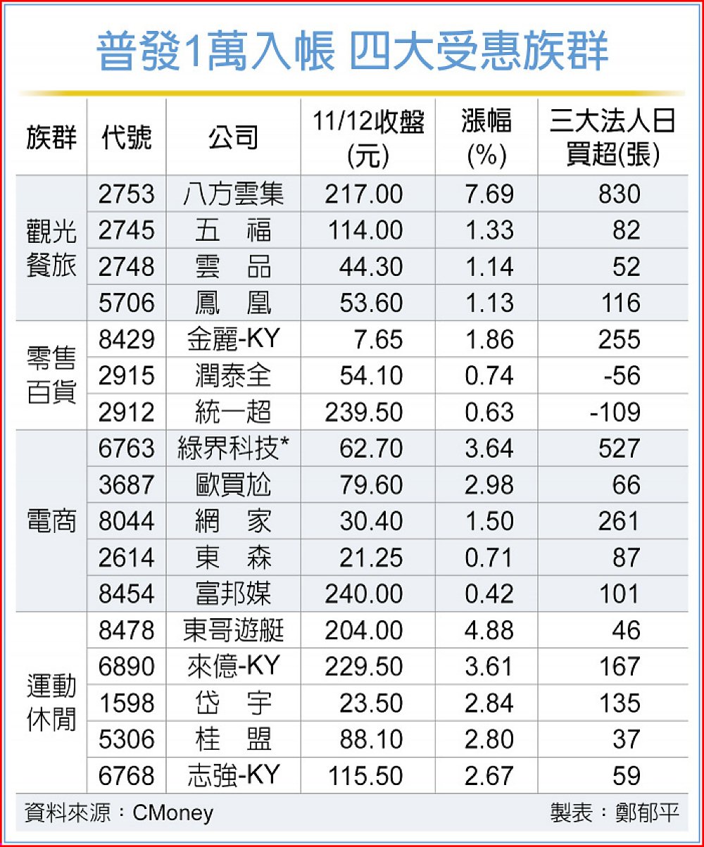 熱錢從天降!普發1萬現金陸續入帳,而除有台灣政府宣布普發現金利多外,全球最大購物盛典雙11、年底消費旺季也接連登場,觀光餐旅、零售百貨、電商、運動休閒四大族群摩拳擦掌備戰旺季行情,八方雲集(2753)盤中奔漲停一度擠下王品(2727)搶登觀光股王,綠界科技*(6763)、網家(8044)、東哥遊艇(8478)等多檔同步嗨翻天。