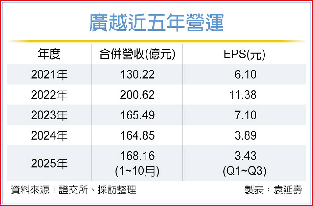 廣越今年10月營收創同期新高,累計前十月合併營收創同期次高。前三季營業利益率達5.9%,年增1個百分點。