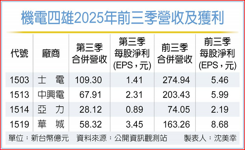 士電(1503)、中興電、亞力及華城(1519)等機電四雄,皆因台電強韌電網計畫釋單受益,第三季、前三季營收都創同期新高。士電第三季EPS為1.41元、前三季EPS達5.46元;華城第三季EPS為3.45元、前三季EPS達8.68元。