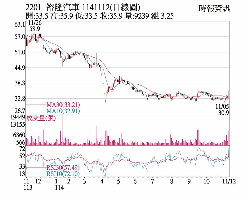 裕隆(2201)欲把納智捷股權移轉至鴻華先進,與鴻海攜手力拚擴大電動車版圖方向受市場認可,12日吸引買盤進駐,股價開高後早盤直奔漲停35.9元並鎖住,一舉收復短中長期均線,短期均線向上,KD亦呈現走多格局,外資及自營商聯手買超1,719張,單日成交量9,239張,漲停委買張數7,089張。