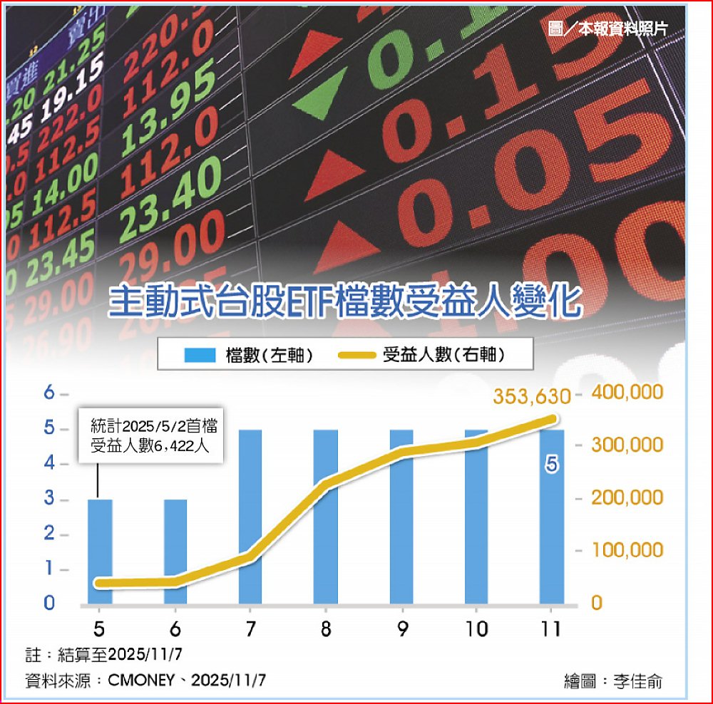 投信法人表示,台股主動式ETF不僅人氣旺,績效、規模表現也出色。以2025年4月川普投下全球貿易戰的震撼彈後,適逢國內主動式台股ETF陸續掛牌上市,雖基金募集成效不彰,但半年後檢視績效,平均超過3成的報酬率,打敗各類台股基金,至今整體規模也衝至約660億元的新高。