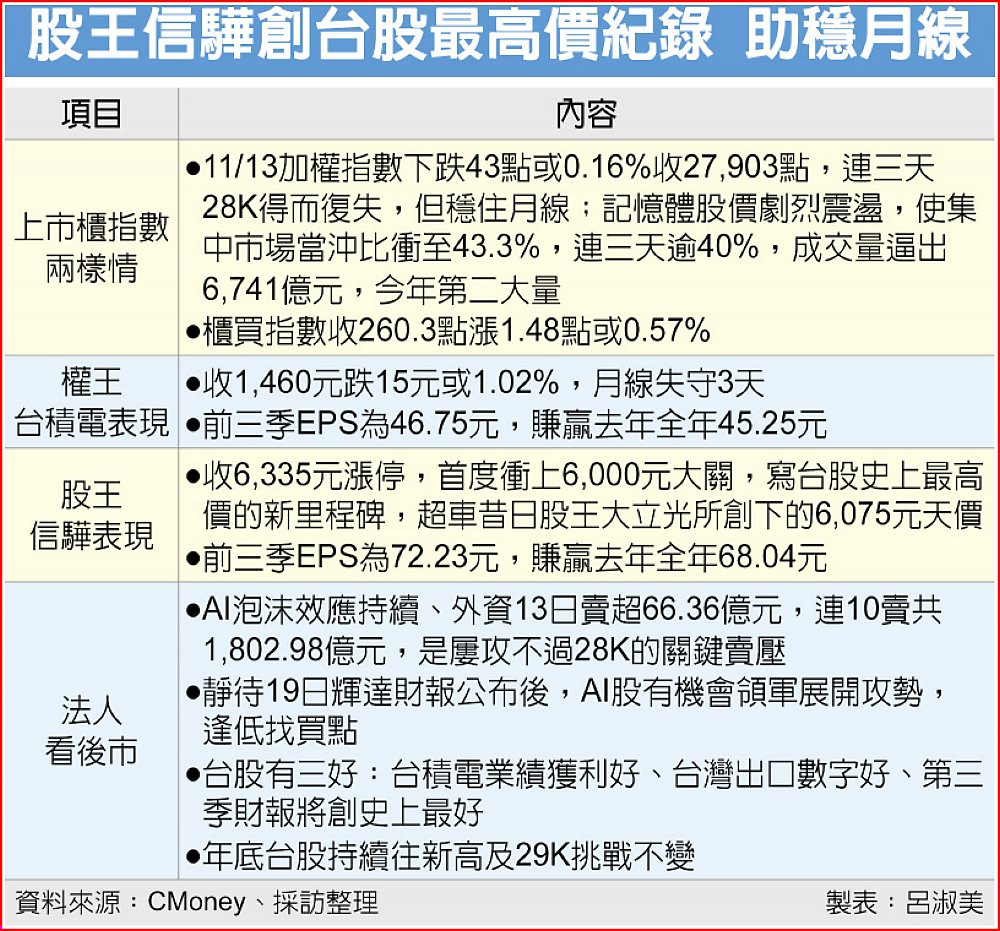 美國政府近期可望結束史上最長的停擺利多,與AI泡沫化隱憂交雜影響投資人情緒,權王台積電13日停電,終場下跌15元收在1,460元,月線失守三個交易日,拖累加權指數連三天上演28K得而復失的戲碼。