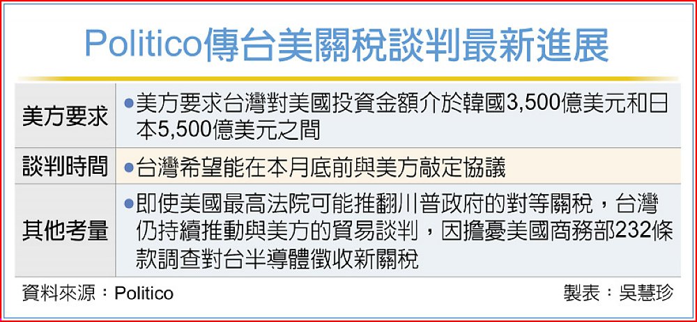 台美關稅談判傳將塵埃落定。據美媒報導,儘管川普政府對等關稅可能遭美國最高法院推翻,台灣顧及「232條款」調查仍致力與美國達成關稅協議,投資美國金額可能介於韓國3,500億美元與日本5,500億美元之間,力拚本月底前敲定協議。