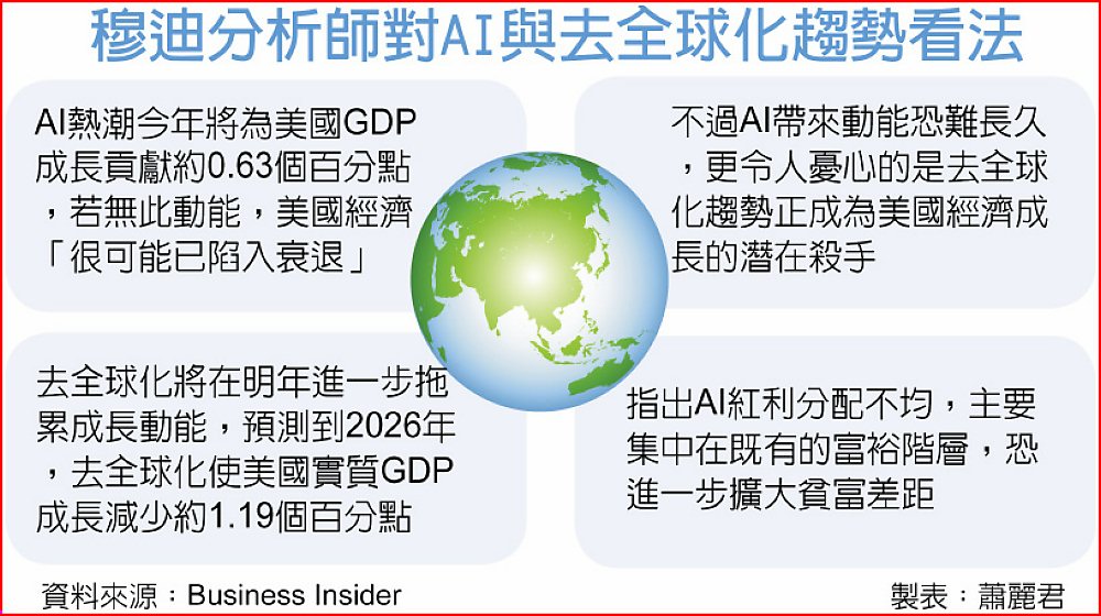 儘管AI熱潮帶動美國經濟與股市持續上揚,但穆迪分析公司(Moody’s Analytics)首席經濟學家贊迪(Mark Zandi)並不樂觀,他表示,令人擔憂的是,「去全球化」趨勢正成為美國經濟成長的潛在殺手。