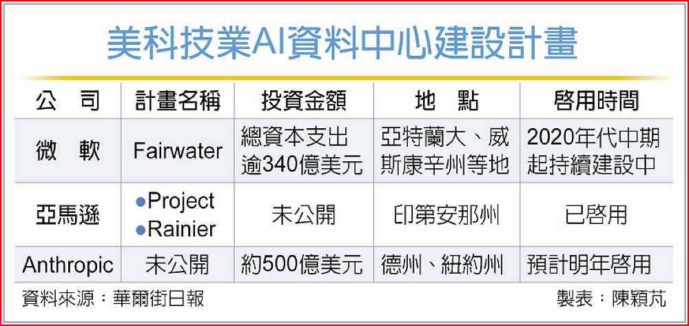 AI新創公司Anthropic也宣布,將投資500億美元在美國打造高效能運算基礎建設,包含德州與紐約州兩地的專屬資料中心,預計明年啟用。這些計畫反映科技業正大舉投入AI基礎建設,全年總投資額估計達4,000億美元,競逐AI時代的運算主導權。