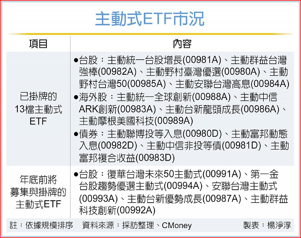 12月起也有多檔主動式ETF將募集與掛牌,包括復華台灣未來50主動式、第一金台股趨勢優選主動式、安聯台灣主動式、主動台新優勢成長、主動群益科技創新等,全數為台股主動式ETF,多家投信紛紛推出王牌基金經理人來操作。