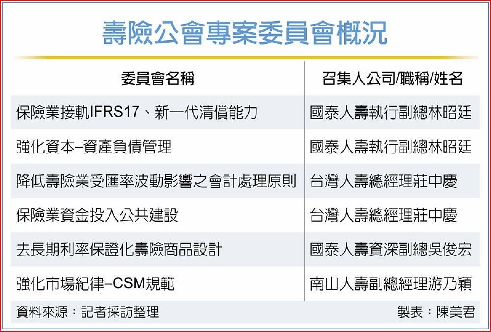 「去長期利率保證化壽險商品設計」委員會是為提升業者因應長壽風險與利率波動能力、提供差異化商品選擇,研議可行之建議方案,召集人為國壽資深副總吳俊宏,副召集人為凱基人壽副總謝如涵;「強化市場紀律─CSM規範」委員會,主要是維護良性競爭及市場紀律,由南山人壽副總游乃穎召集,富邦人壽資深副總黃國祥為副召集人。