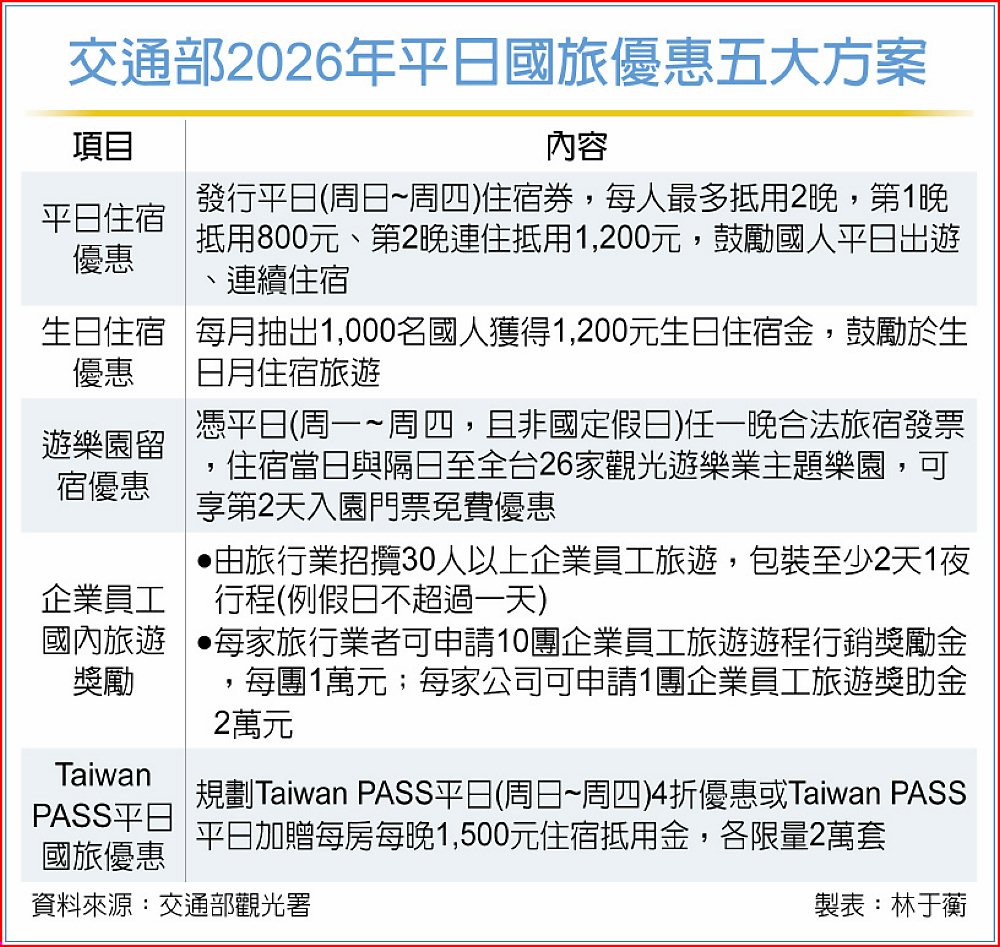 交通部長陳世凱13日透露,2026年國旅促進優惠五大方案的內容。考量國旅尖離峰差異大,將針對平日旅遊發行住宿券,提供第一晚補800元、第二晚連住再抵1,200元,鼓勵連續住宿,同時,將在每月抽出1,000名的壽星,提供1,200元生日住宿金。