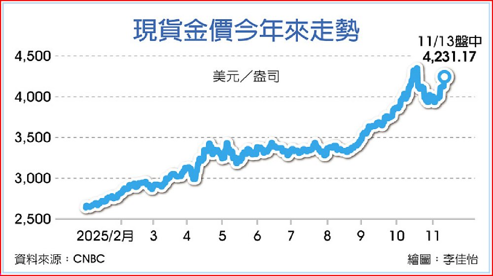 隨著美國政府停擺結束,市場預期聯準會在下月降息可能性大增,推升國際金價連續第5個交易日走高,13日盤中更漲破每盎司4,200美元關卡。多家投行對金市前景看多,其中瑞銀(UBS)預期金價有望一年內攀升至4,700美元,至於花旗集團(Citi)更拋出驚人預測,預估金價可能在2027年底觸及6,000美元。