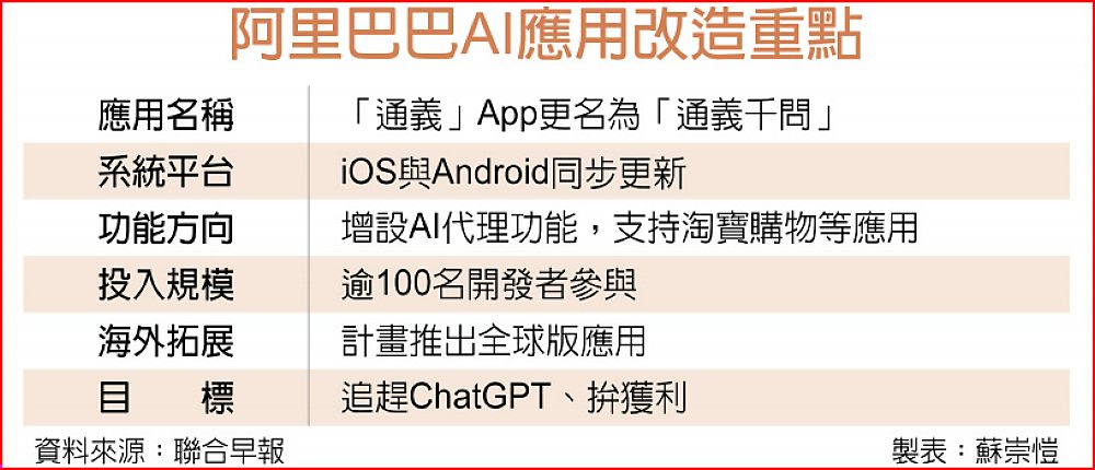 綜合外媒報導,知情人士透露,阿里巴巴計畫首先更新其在iOS和Android系統上的現有「通義」App,並重新命名為「通義千問」,以其著名的AI模型命名。阿里巴巴將在未來幾個月逐步增加AI代理功能,以支持包括淘寶在內的主要平台上的購物需求。