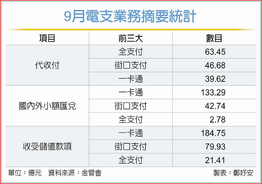 9月全體電支機構代理收付實質交易款項金額約213.61億元、月增9.4億元。業者盤點原因,主要受惠於中秋連假出遊帶動消費、電商促銷檔期,以及公務代繳費用集中等因素。