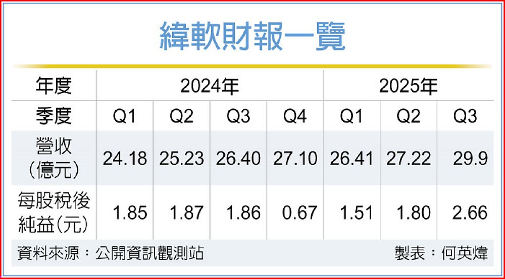 緯軟第三季合併營收29.9億元,季增10%,年增14%,毛利率18.3%;營業利益2.24億元,年增逾五成,營益率回升至7.5%,稅後純益1.94億元,每股稅後純益2.66元,創成立以來新高。
