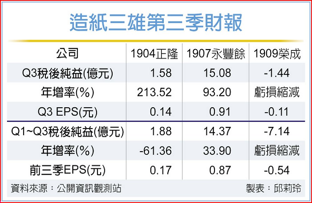 造紙三雄營運旺,永豐餘(1907)、正隆(1904)第三季獲利均年季雙增。其中永豐餘在永豐金等股利挹注下,第三季稅後純益15.08億元、年增93.2%,帶動前三季轉盈,每股賺0.87元;正隆受惠越南迎轉單提振工紙需求,加上原料價格調降,第三季稅後純益1.58億元、年增2.13倍,前三季每股賺0.17元。