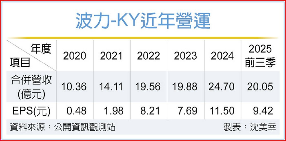 波力第三季合併營收7.03億元,本業獲利2.13億元、稅後純益1.60億元,EPS由去年同期的2.82元增加至3.18元。前三季合併營收20.05億元、本業獲利5.56億元、稅後純益4.81億元,EPS由去年同期的8.02元增至9.42元。