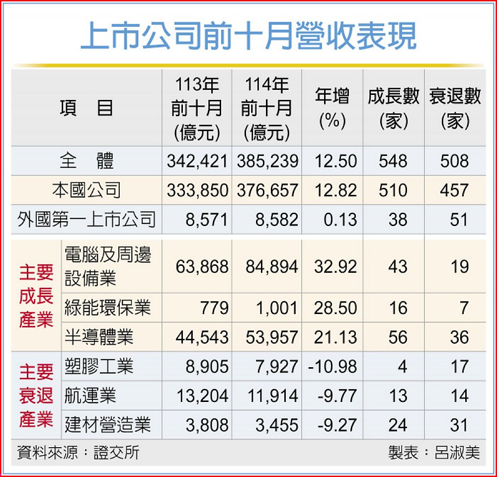 證交所統計,10月營收年增前三大產業為金融保險、電腦及周邊設備、資訊服務等,各年增58.06%、24.76%、23.26%;累計前十月營收年增前三大產業依序為電腦及週邊設備、綠能環保及半導體等,年增各32.92%、28.5%、21.13%。