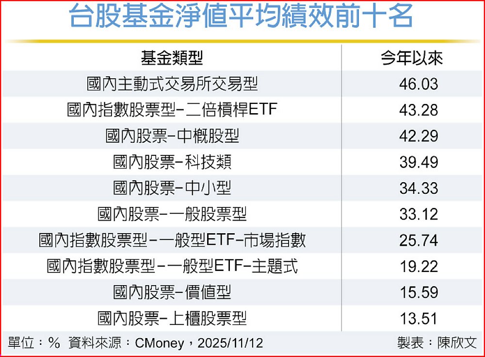 觀察台股主被動各類型基金今年來的績效平均表現,其中以主動式台股ETF平均上漲46.03%表現居冠,其次漲幅逾3成以上的依序為台股正2ETF43.28%、中概型42.29%、科技型39.49%、中小型34.33%、一般股票型33.12%。