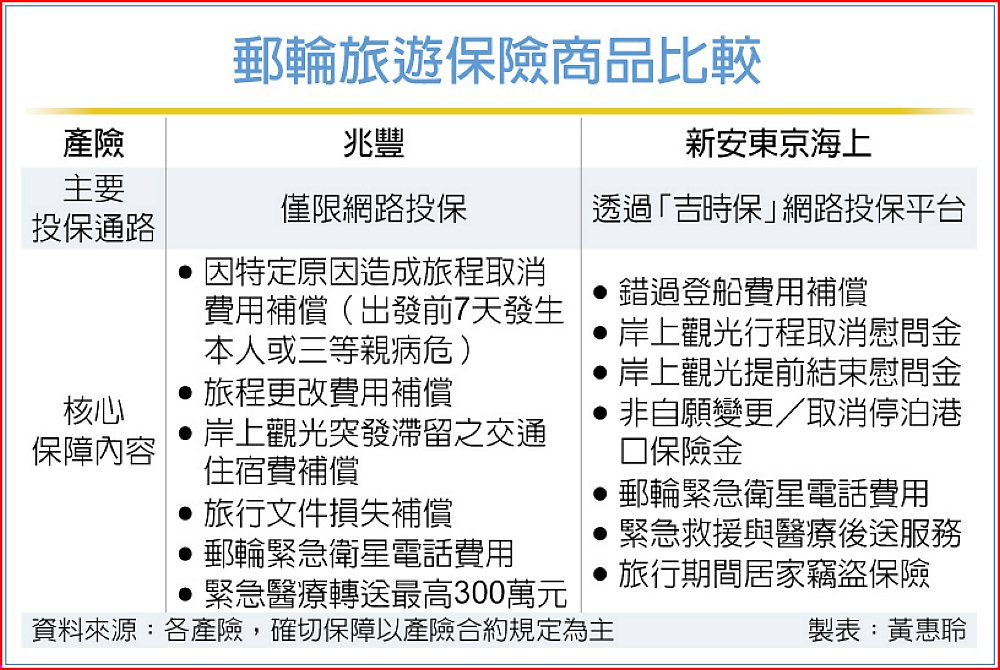 隨著郵輪旅遊市場復甦、出海航線持續擴增,國內產險業者積極搶攻郵輪旅遊保險商機。繼兆豐產物保險率先推出郵輪旅遊綜合保險後,新安東京海上產險也在近期正式推出同類型商品,讓市場上專為郵輪旅客設計的保單數量從一家增至兩家。