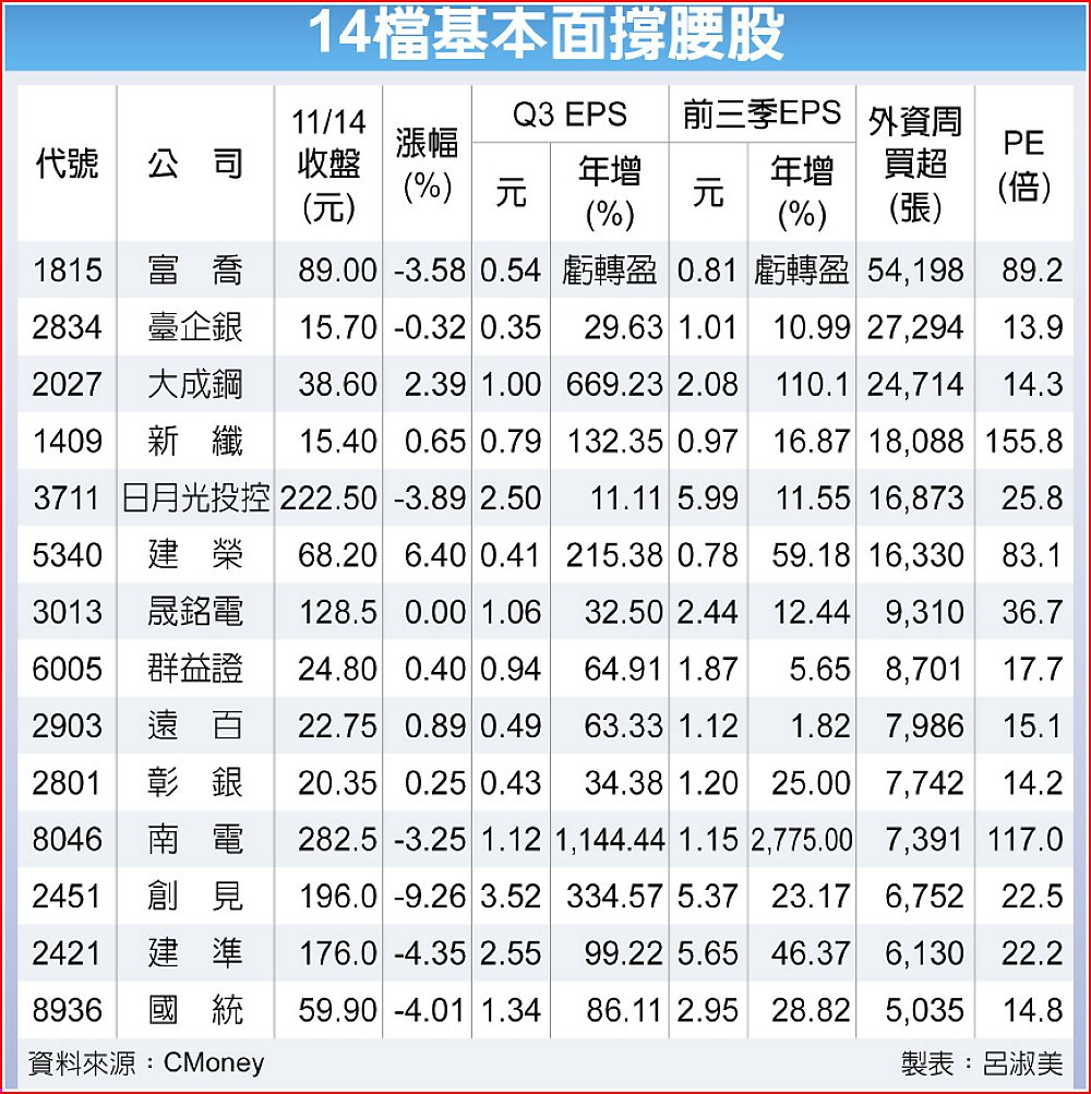 AI股泡沫疑慮加大,台股14日重挫506點,月線失守,整理期恐加長。法人建議,此時選股宜「趨吉避兇」,首重基本面,第三季及累計前三季每股稅後純益(EPS)雙增、外資本周買盤力挺,有機會成盤震盪時的資金避風港,計有日月光投控、晟銘電、創見等14檔。