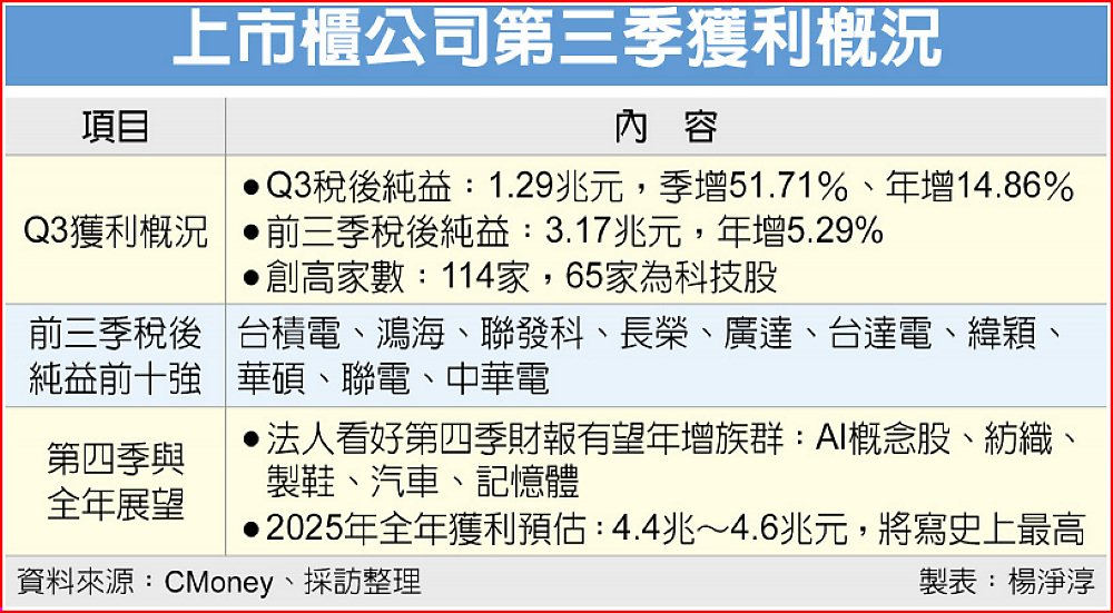 受惠台積電、台達電、緯穎等大型指標股營運動能,大幅優於過往,加上第三季匯兌損失回沖,上市櫃公司第三季財報繳出史上最亮眼佳績,加計金控自結數的整體獲利來到1.29兆元,季增51.71%、年增14.86%,創下今年單季獲利新高、歷年最高第三季獲利、史上最旺單季獲利等三大新高紀錄。