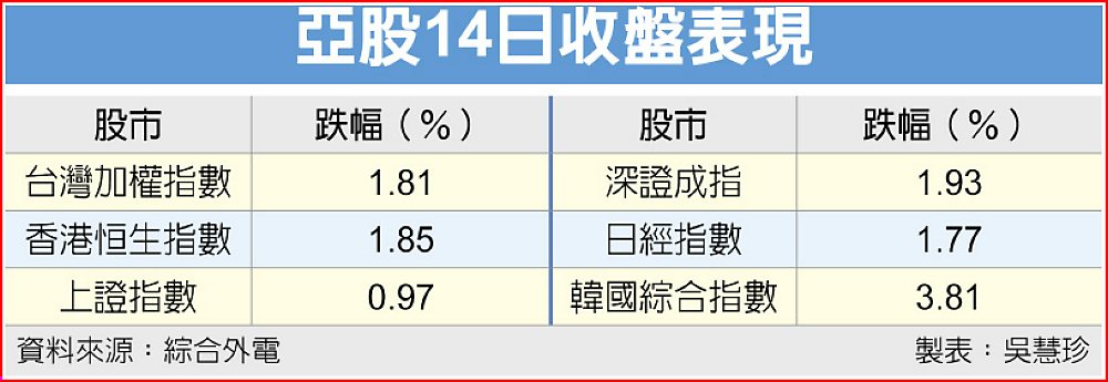 AI泡沫疑慮未散,加上美國聯準會(Fed)12月降息預期驟降,不僅美股13日殺聲隆隆、創一個月來最大單日跌幅,連帶拖累亞股14日兵敗如山倒,主要指數皆墨,台股收盤重摔逾500點、韓股狂瀉近4%,日港陸股也有近2%跌幅。