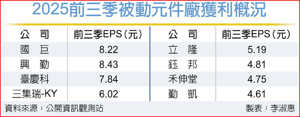 被動元件廠2025年前三季獲利前五強出爐,龍頭廠國巨*稅後純益以169億元遙遙領先,保護元件廠興勤因國巨股票分拆,前三季EPS以8.43元首次奪冠。族群前五強獲利均逾半個股本,從前三季獲利進度來看,法人預估,國巨、興勤、臺慶科今年獲利可望自一個股本起跳。