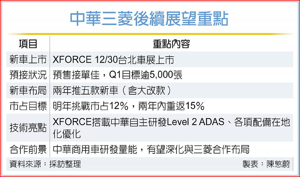 中華車於10月31日啟動XFORCE預售後,接單穩定成長,曾鑫城已設定新車上市後,明年第一季訂單突破5,000張目標;隨三菱的五款新車陸續到位,將助攻中華車兩年內市占衝上15%。