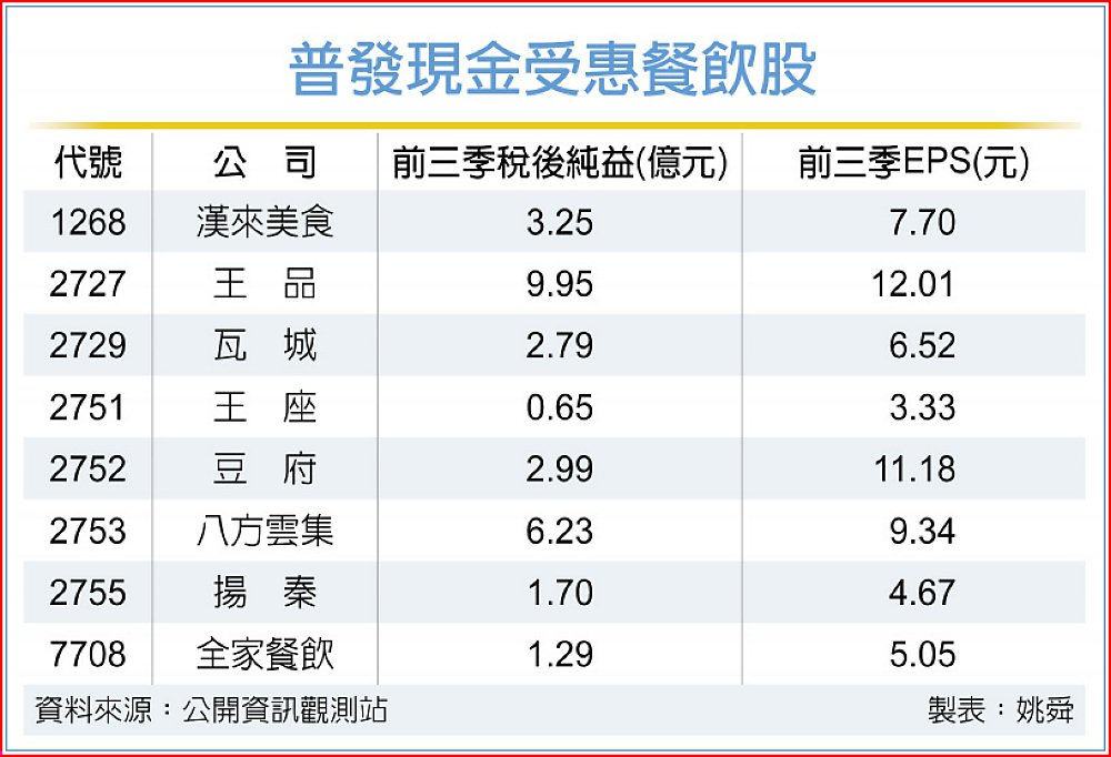普發萬元現金上路,利多政策激勵民眾消費信心,加上第四季是餐飲傳統旺季,連鎖餐飲集團因營運升溫成為市場關注焦點。法人看好旗下有多品牌、多業態,具經濟規模且持續拓點展店的王品(2727)、八方雲集(2753)、豆府(2752)、漢來美食(1268)、瓦城(2729)、揚秦(2755)、全家餐飲(7708)等連鎖餐飲集團,第四季可望維持強勢營運動能,推升營收成長並受市場資金關愛。