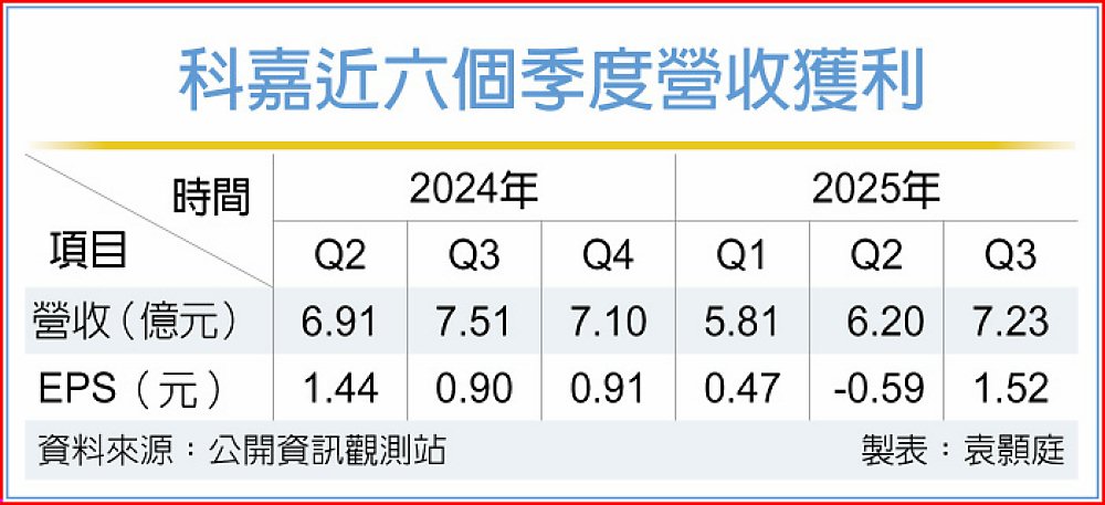 科嘉-KY前三季累計合併營收19.24億元,年減3.36%,受銀價上漲、新台幣升值等影響,毛利率減至23.93%,營業利益1.32億元,年減30.16%,稅後純益9,029萬元,年減50.55%,EPS 1.4元。