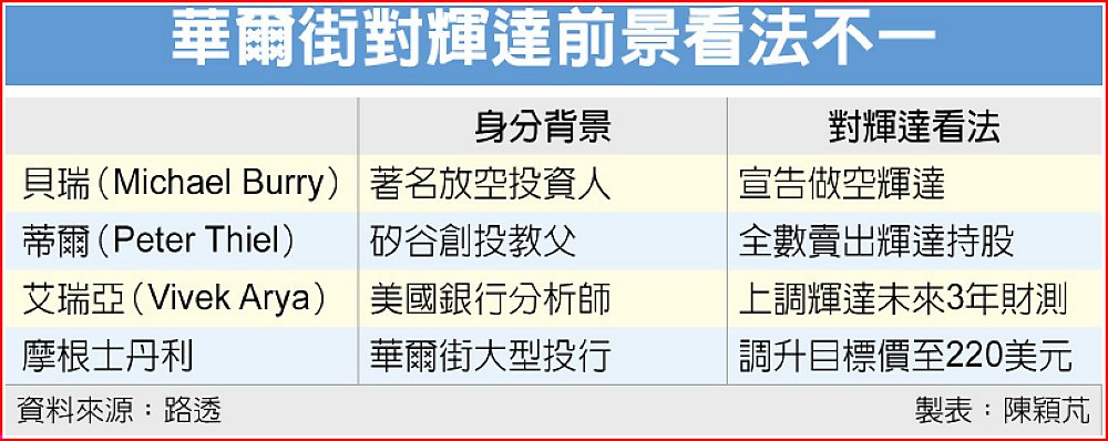 輝達19日將公布上季(8至10月)財報,市場屏息以待。儘管知名放空投資人貝瑞(Michael Burry)近日宣告做空輝達,素有「矽谷創投教父」稱號的億萬富翁蒂爾(Peter Thiel)也全盤出脫輝達股票,但美國銀行分析師仍舊調升輝達財測。