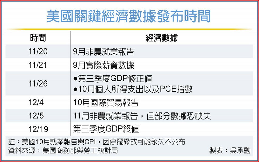 據美國經濟分析局(BEA)、美國勞工統計局(BLS)與外電資料彙整,重要經濟數據公布時間如下,11月20日將率先公布9月非農就業報告、21日為9月實際薪資數據。26日將發布第三季度GDP修正值,當天10月個人所得支出以及PCE指數也將出爐。