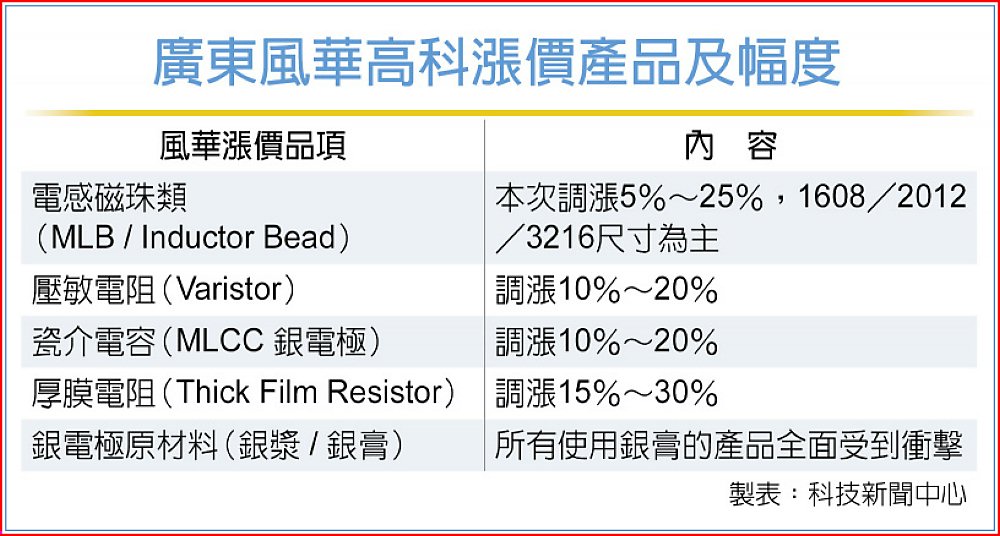 被動元件再傳漲聲,陸資被動元件龍頭風華高科針對代理商、直接客戶同步發出漲價通知,該公司在信件中表示,由於金屬銀價今年以來已經上漲50%,其他金屬材料也全面性上漲,成本承壓,因此將針對電感磁珠、壓敏電阻、瓷介電容、厚膜電阻類產品上調5%~30%,且即日起新訂單採用新價。