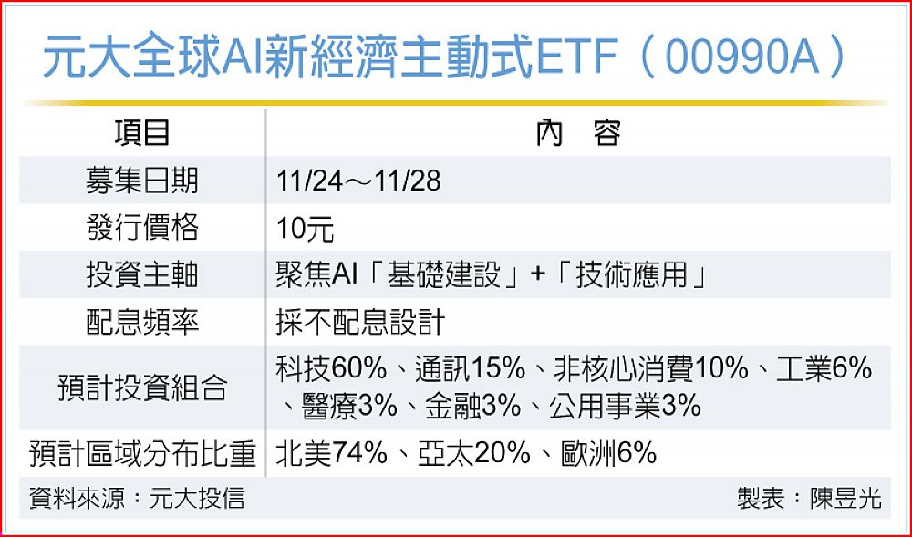 國內ETF龍頭元大投信17日宣告正式加入主動式ETF戰局,將發行旗下首檔主動式ETF-元大全球AI新經濟(00990A),預計24日啟動募集。元大投信指出,00990A聚焦未來AI全方位應用發展,發行價10元,採不配息設計,可望再度創造一波主動式ETF投資熱潮。